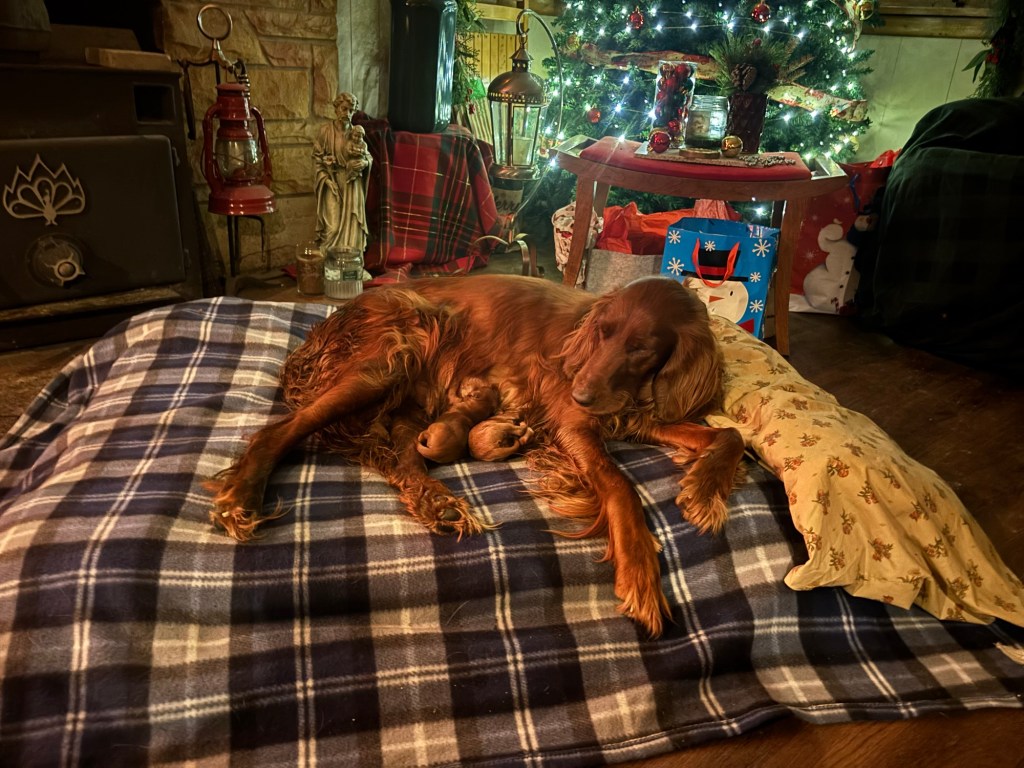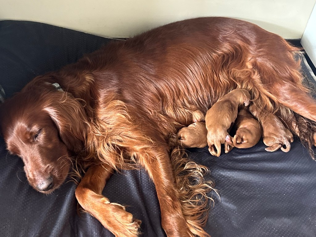 There are FOUR pups! I’m 99.9% sure there are 3 females & 1 male. But, I haven’t double checked because they have been napping & nursing so cooperatively!